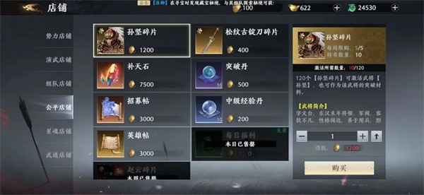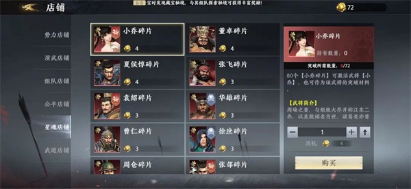 星魂店铺:作为抽卡核心商店,有耐心可每周买满十个孙坚碎片,多余碎片用于升阶,开服首日若冲战力可提升重复的夏侯惇或董卓,高阶需求碎片量较大,不建议主换单一武将。