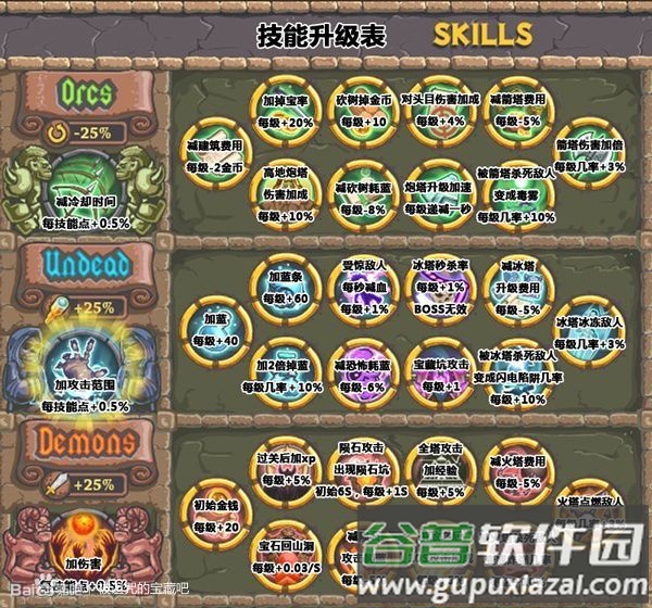 兽人系第四列第二个技能原翻译有误,实际效果为每7秒获得一次经验,每升级一次减少1秒间隔。