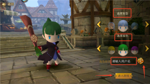 6、确定职业后进入角色定制,可调整发型与发色;输入角色名称时,若难以决定可点击骰子图标随机生成,最后点击进入游戏即可。