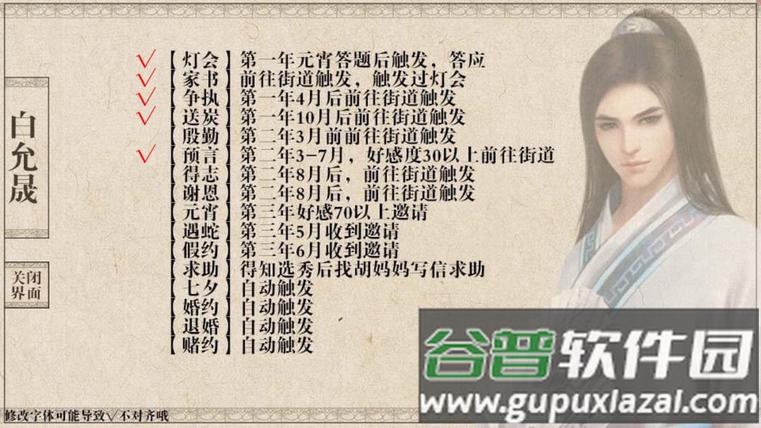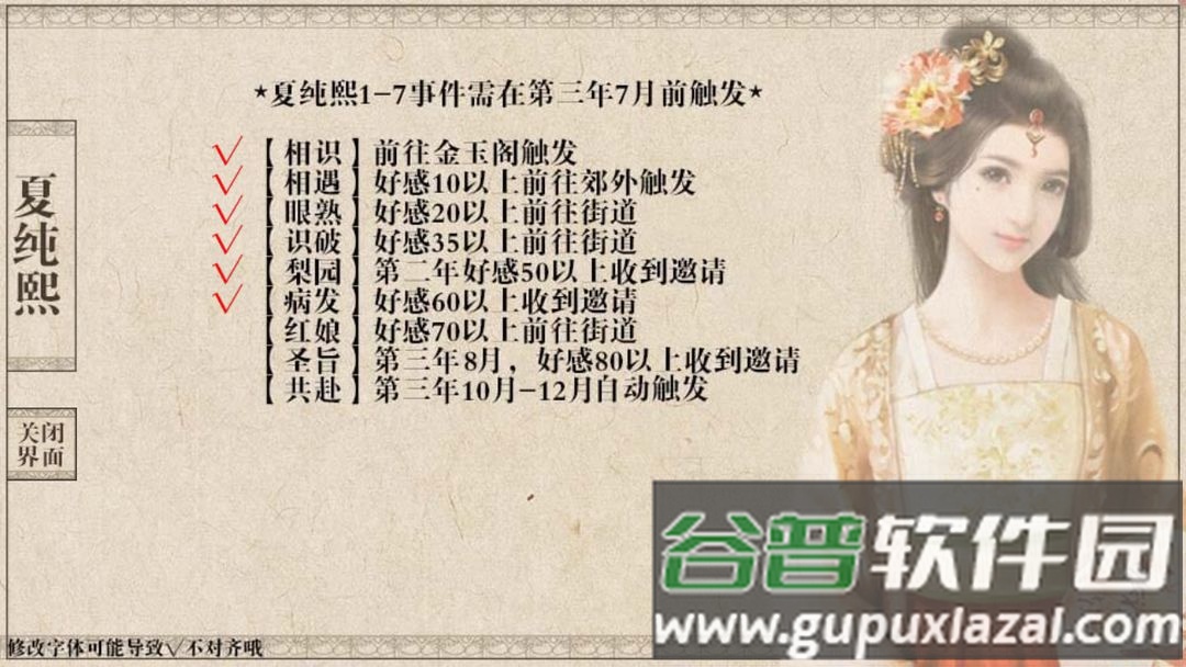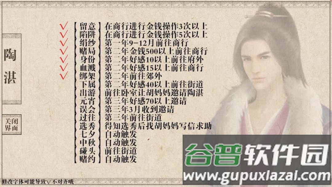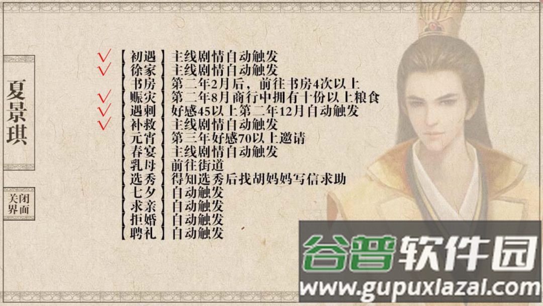 注意每个时限事件应在下一事件发生前完成;例如二皇子书房事件需在第二年八月饥荒事件前触发。