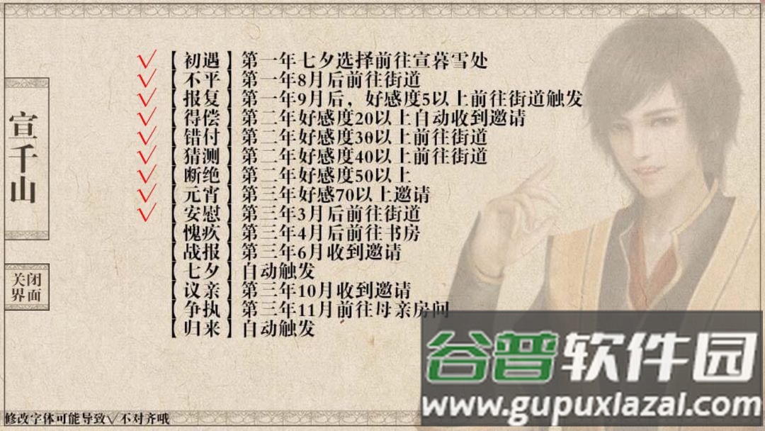 宣千山需七月七夕前往宣暮雪家,八月后街道不平事件,九月后好感5以上触发报复事件。