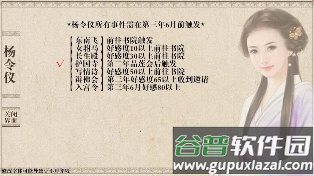 杨令仪前三事件好感需30以上、低于65;