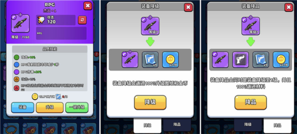 1、装备等级与品阶有材料就提升,均可无损降级。