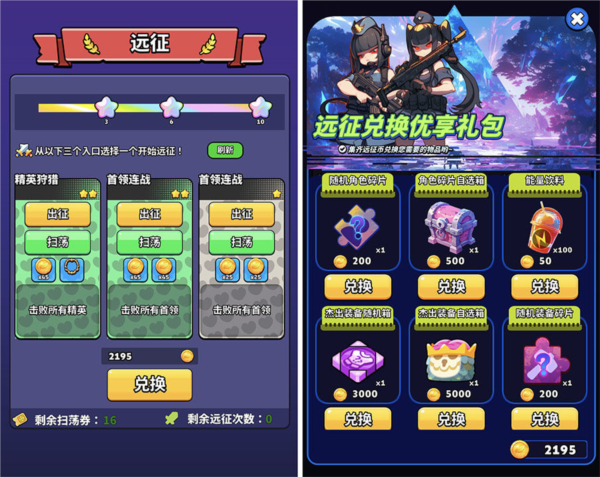 3、第六关开启远征模式,每日次数同样建议打满;远征金币可兑换角色碎片或杰出装备等物资。