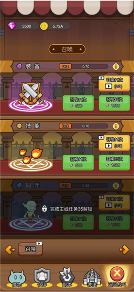 通过关卡“普通1-5”后开启商城,可在商城中召唤装备,多次召唤能提升召唤池等级,更高等级有概率获得更高品质装备。商城内还包含技能与伙伴召唤,每项新能力都能带来显著变化,需通过完成主线任务和关卡解锁。游戏会自动比较装备增益数值,更高增益装备会有红点提示更换;前期建议主升攻击力快速过关并完成主线,解锁小怪兽的不同能力以实现快速成长。