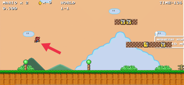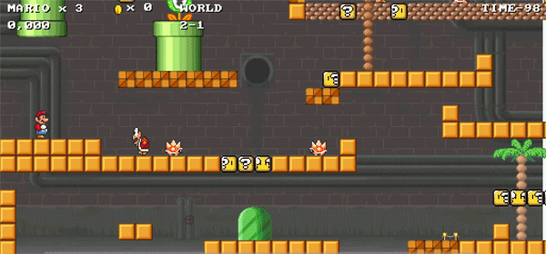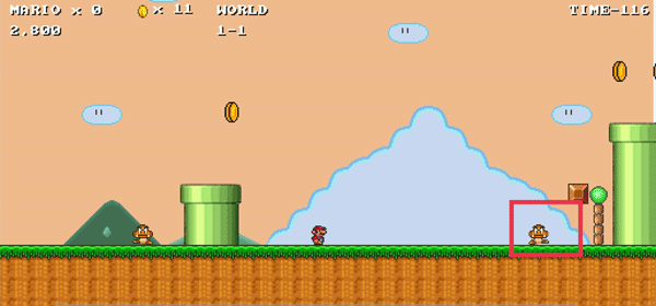 2、靠近砖块时连续跳跃可获得蘑菇与金币,蘑菇能使马里奥体型变大,金币用于购买道具;