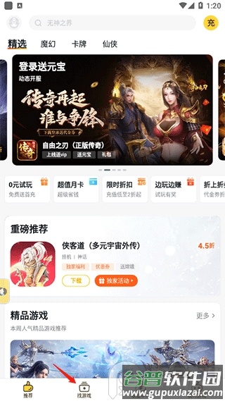 1、下载并打开软件,点击首页的“找游戏”栏目。