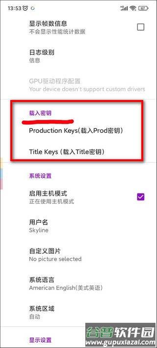 2、下载完成后,进入模拟器设置界面,滑动找到载入密钥选项,分别选择对应文件夹中的prod.keys和title.keys文件进行加载。