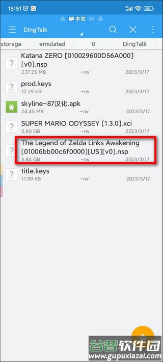 2、以《塞尔达传说织梦岛》为例,该游戏为原始NSP格式ROM,下载后将其存放于手机任意文件夹中并记住路径。