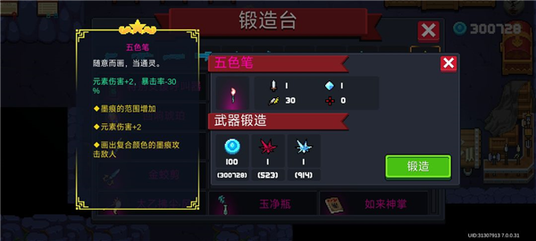 角色选择游侠一技能或刺客三技能等能为武器提供增伤的效果;主武器选用顺手的元素武器,副武器携带五色笔,单纯利用其元素伤害加成词条。