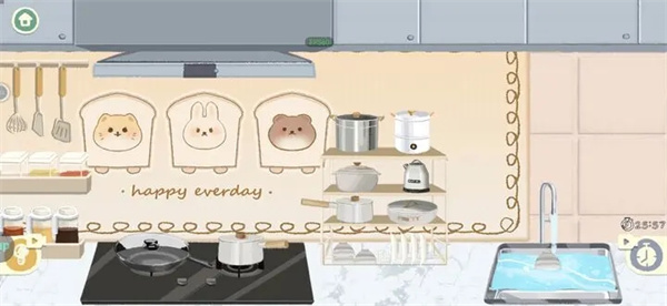 物品归位后向左滑动屏幕,会出现一个水池。将碗和碟子清洗干净,再放入碗架中。