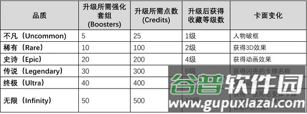 3、升级卡牌需要两种资源:强化套组可通过对战获取;点数可通过每日任务或充值获得。两种资源也可通过天梯奖励或赛季通行证获取。各品质所需资源如下图所示。