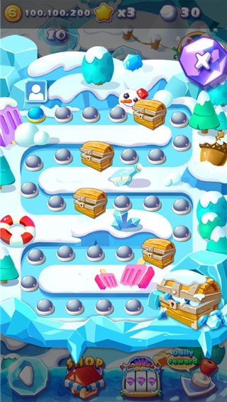 通过交换并匹配三个或更多相同颜色的冰晶,形成连续消除以达到关卡目标;解锁强化道具,收集金币与雪球,为雪人迎接高难度关卡做好准备。