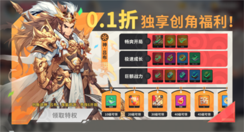 2、创建角色即赠开荒神将吕布,直接晋升至贵族6等级;