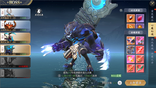 2、心魔幻境每日可挑战两次,VIP等级可增加购买次数;BOSS挑战次数每日零点重置。
