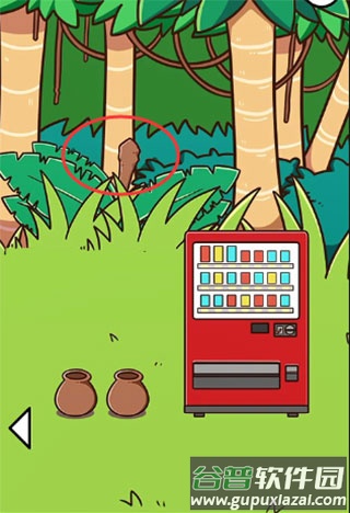 2、首先在第三个场景的草丛里取得木棍,用木棍敲打树干可以获得椰子。第二个场景里有两个椰子,第一个场景也有两个。存在两种过关方法:一种是敲击第二个场景的树干,拿到藏有食物的椰子并吃掉;另一种是敲击第一个场景的椰子,获得硬币后,用硬币到自动贩卖机兑换食物。