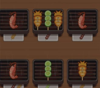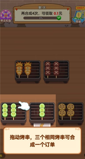 1、首先记住要拖动烤串,将三个相同的烤串合成即可形成一个订单。