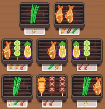 1、游戏规则十分易懂,将三支颜色相同的烤串移动到同一个烤炉上就能实现消除。
