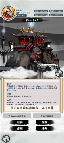 7、修行速度排序为:修炼最快,探险次之,经商与炼丹较慢;门派运转初期选择养殖鱼猪,可获得300灵石。