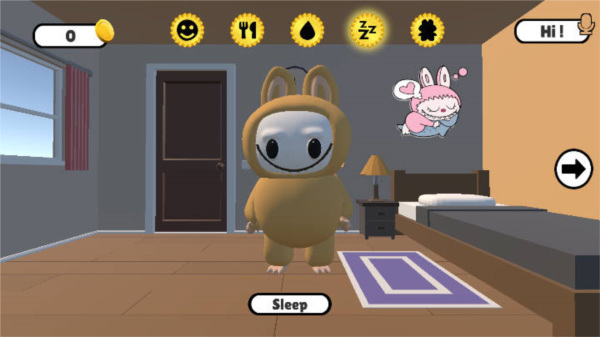 2、进入厨房、客厅等不同场景,像照顾真实宠物一样喂养它、帮它洗澡,并在它休息时轻轻盖好被子。