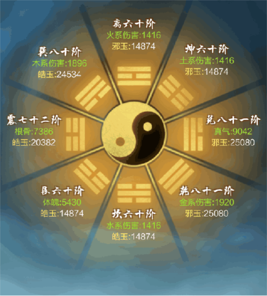 3、注意事项:皓玉邪玉避免用于购买时装,集中升级八卦;八卦提升侧重根骨,避免平均分配。