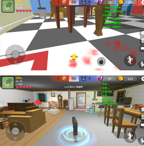 寻找者主要依靠观察与攻击,可以点击可疑目标进行试探,也能使用枪械等武器进行远程抓捕。游戏提供了学校、公寓、城堡、太空站、火星基地等二十三张风格迥异的地图,每张地图中躲藏者可选择的伪装物品超过六十种。