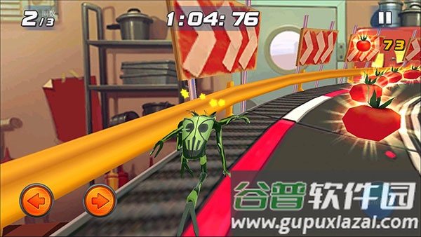 需要灵活躲避赛道障碍,碰撞会导致减速;同时收集赛道上的番茄能获取额外分数。