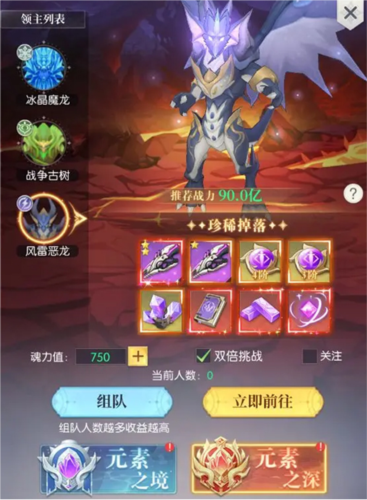 元素之境设有多层,需达到相应战力方可进入,对首领完成最后一击的玩家将获得归属奖励,其余参与者可获得参与奖励。元素之境包含风、水、火、土四种元素,击败首领会消耗精力,层数越高消耗精力越多,奖励也越丰厚。