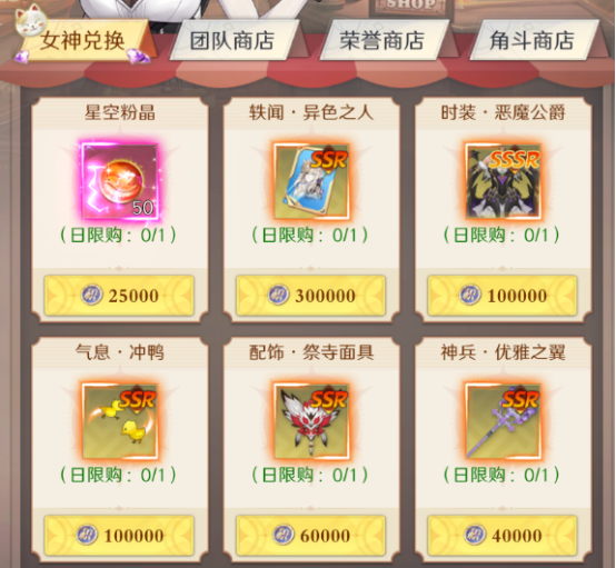 所得积分可用于在女神商店中兑换稀有奖励。