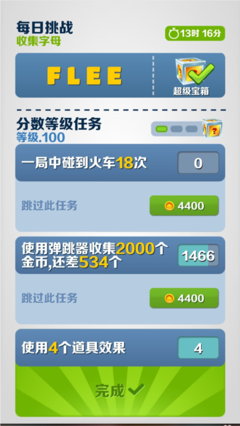 游戏初期首要目标是将任务中心等级提升至30级。任务中心位置参考下图,30级前每升一级倍数增加1倍,最高可达30倍;30级后每级奖励变为白金宝箱。因此第一天应尽快完成任务达到30级,可使用金币跳过耗时较长的任务,例如连续三天收集字母等。