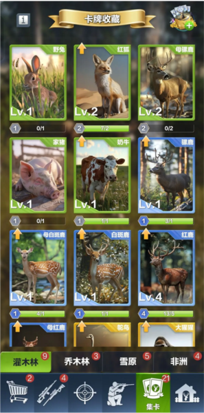 游戏内置了独特的卡牌收集系统;每次成功狩猎都会获得碎片,用以解锁对应的动物卡牌;每张卡牌都拥有不同的分数加成技能,升级卡牌能进一步提升加成效果。