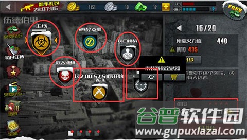 关卡选择界面分为六个部分:主线、刷钱、BOSS、每日挑战、狙击关卡与活动。跟随主线推进,角色等级会逐步提升,各项功能也随之解锁。点击屏幕中央图标可选择模块,右侧会显示对应关卡的详细信息,包括关卡编号、所需火力以及难度奖励。选定关卡后,点击开始按钮即可进入战斗,消灭僵尸并救援幸存者。