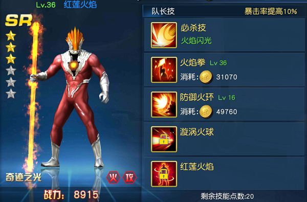 6、稀有级:红莲火焰;红莲火焰能打能突,但初始属性较低,注定作为过渡角色使用,无需刻意培养