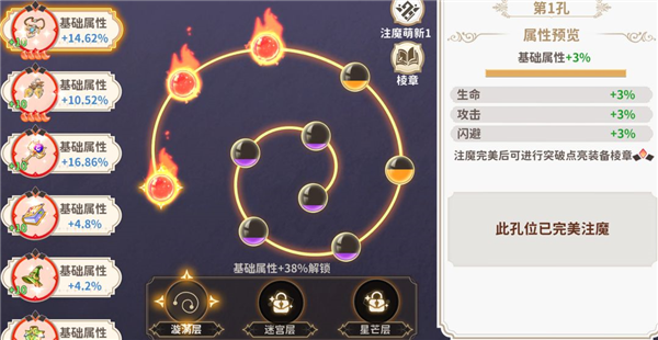 注魔孔位升满后,可消耗超魔光轮进行突破,进一步放大属性百分比;荣誉商店每周可稳定兑换1个光轮,不要遗漏。