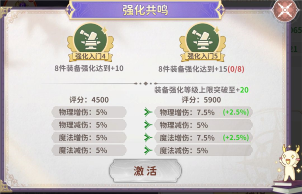 装备强化共鸣提供大量战力加成,提前激活可建立优势。
