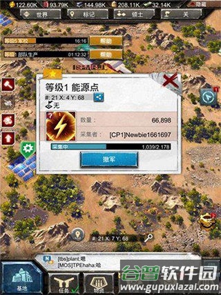 点击游戏内地图界面,可查看自己基地周边的能源点、麦田、油田等设施;每个设施均标注了储量、等级及当前采集者信息。点击“采集”即可派遣部队前往占领;派遣的部队数量越多,单次可承载的资源量就越大。部队抵达后自动开始采集,进度满额后自动返回。