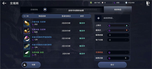 3、点击“结算”按钮,可以一次性领取所有已售出道具所得的黑珍珠。交易行会收取税费,结算时玩家获得的是扣除税费后的金额;其中装备类道具每日最多可结算五次。