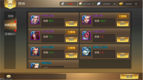 玩家最多可让两名同伴同时登场作战;同伴按品质分为紫色、蓝色与绿色,其成长体系与主角相似,均具备装备、法宝、技能及培养功能;同伴可通过消耗同伴灵魂合成获得,而同伴灵魂又可由对应的碎片合成,相关操作均在同伴界面完成;这些材料主要来源于【抽奖】活动与【同伴商店】;其中【抽奖】有几率直接获得完整同伴卡牌,若抽到已拥有的同伴,则会自动转化为5个该同伴的灵魂;在【同伴商店】中,玩家可以使用神魂兑换同伴灵魂或其碎片。