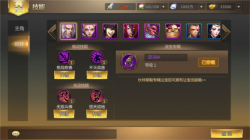 每位同伴都拥有独特的专属技能,同时还具备法宝专精技能;只有当同伴装备了其专精法宝时,才能在战斗中施放对应的法宝技能,否则装备普通法宝仅能获得属性加成;同伴技能的升级方式与主角相同,且技能等级不能超过同伴自身的等级。