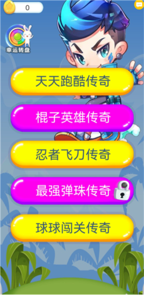 1、进入游戏可见五种闯关模式,包括跑酷传奇、棍子英雄传奇、忍者飞刀传奇、最强弹珠传奇和球球闯关传奇。