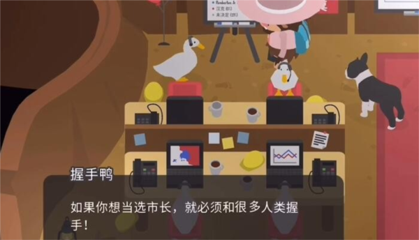 2、向握手鸭学习握手技巧,随后在城镇中找到三十位头顶有黄色感叹号的居民并与之握手。