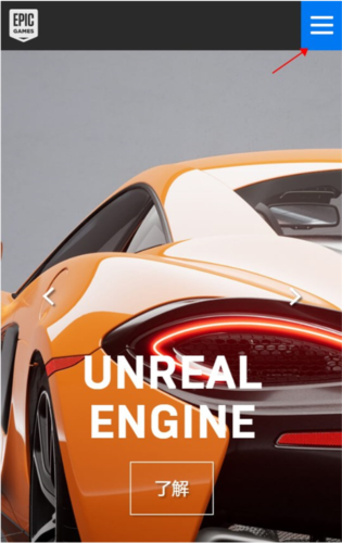 1、首先访问epic game官网,点击右上角的三条横线图标。