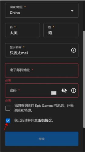 5、填写所需信息,勾选同意条款后点击继续。