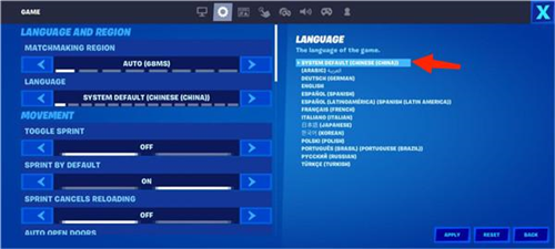 2、在language语言栏中找到SYSTEM DEFAULT ( CHINESE ( CHINA , HANS ))并点击切换。