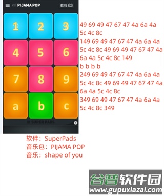 2. 乐谱右侧的数字与字母分别对应界面的按键,紧挨在一起的符号代表需要同时按下。