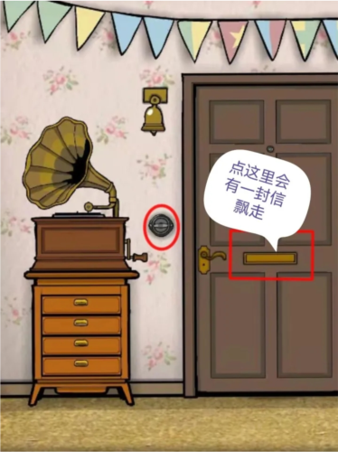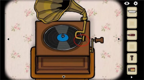 5、祖父需要音乐,回到初始场景;打开唱片机将针放在下图红圈位置,点击该处后再扳动把手。