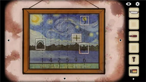 2、第三场景关闭左边打开的盒子,取走上面银币;点击父亲,掉出明信片,记住四个标志顺序;翻面拿走两张邮票。