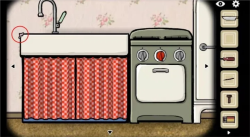 7、取下烧开的水壶,窗户因水汽起雾;参照第三场景墙上的图,在窗上画一棵树;高能后取下玻璃碎片。水池边泡泡糖粘住苍蝇,取下;用热水浇初始场景门外显露的脚印,得到电池。