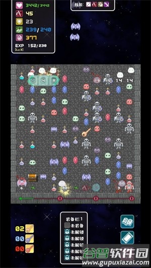 1、战斗方式:玩家在魔塔中通过点击屏幕攻击怪物,每次点击消耗一点MP;MP耗尽后需等待自然恢复。击败敌人可获得经验,经验满后升级,并从多个新技能中选择一项进行强化。角色可以搭配装备,装备来源于开启宝箱或击败怪物。