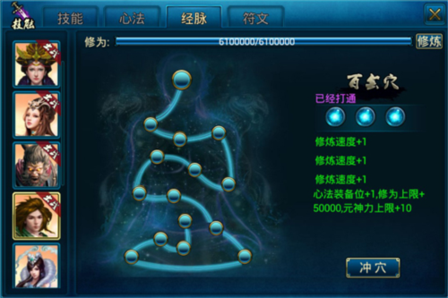 1百会穴:每打通一次,修炼速度加1;第三次打通额外增加角色元神力上限50点。